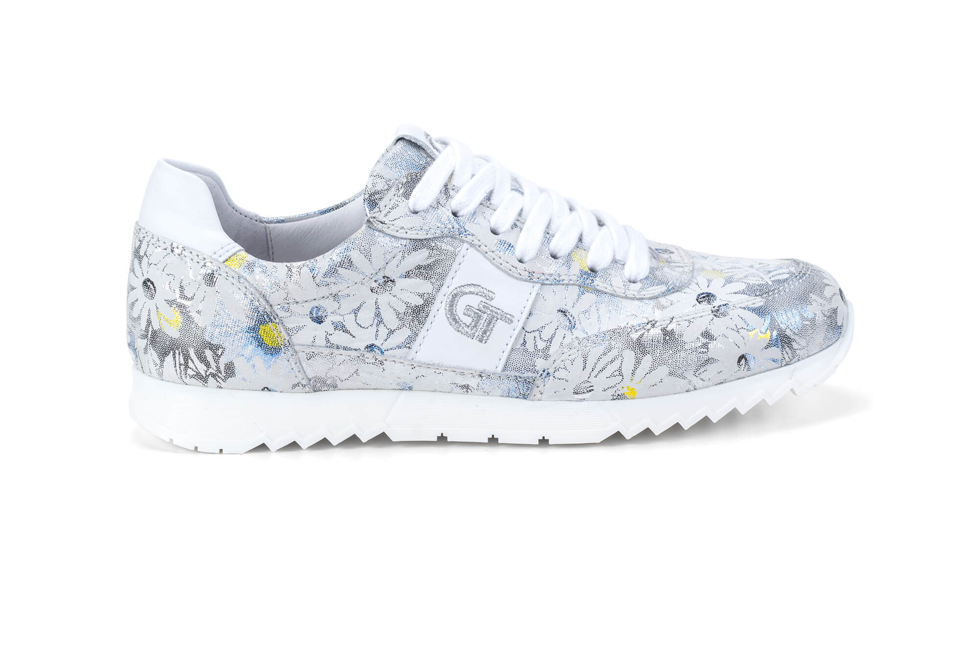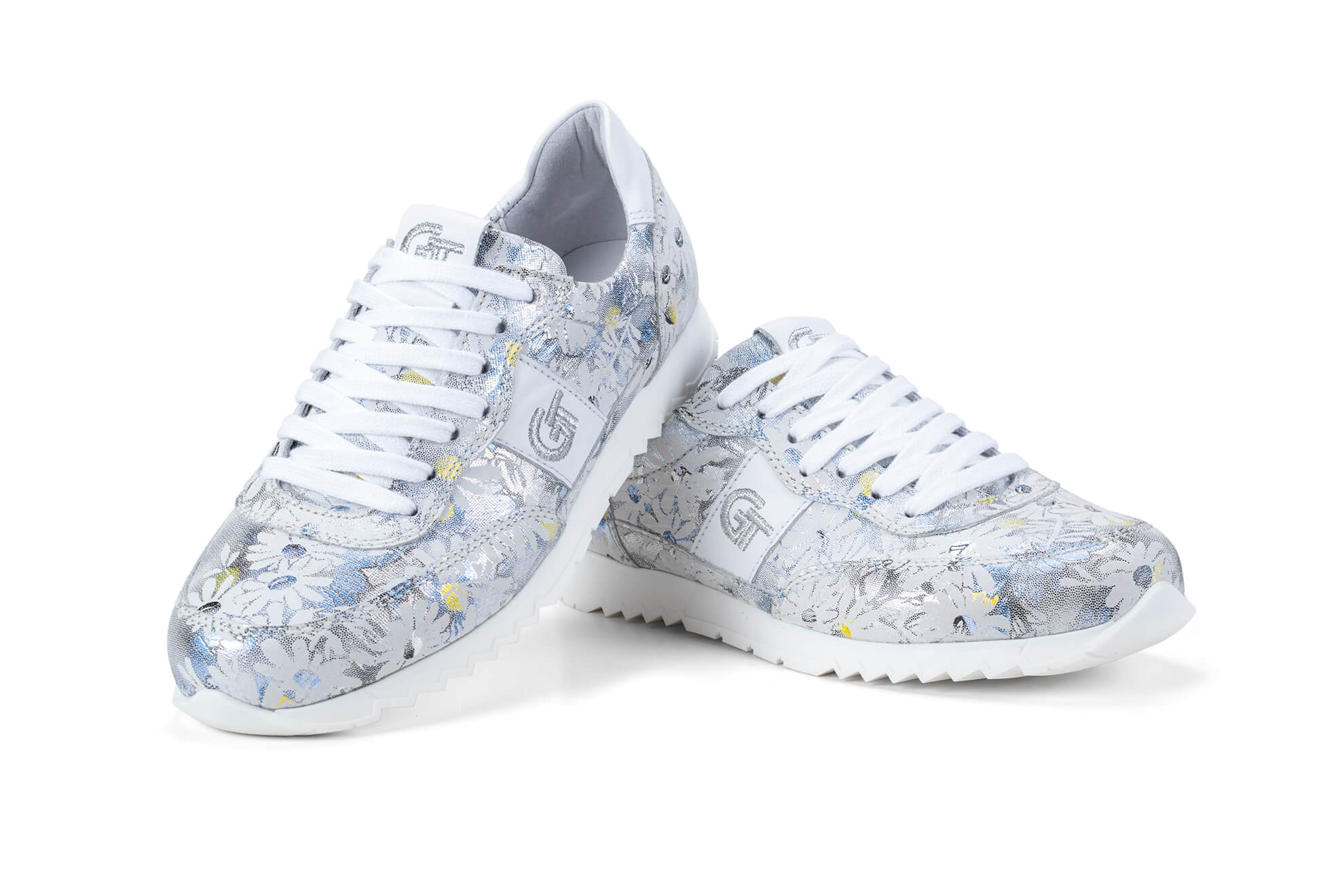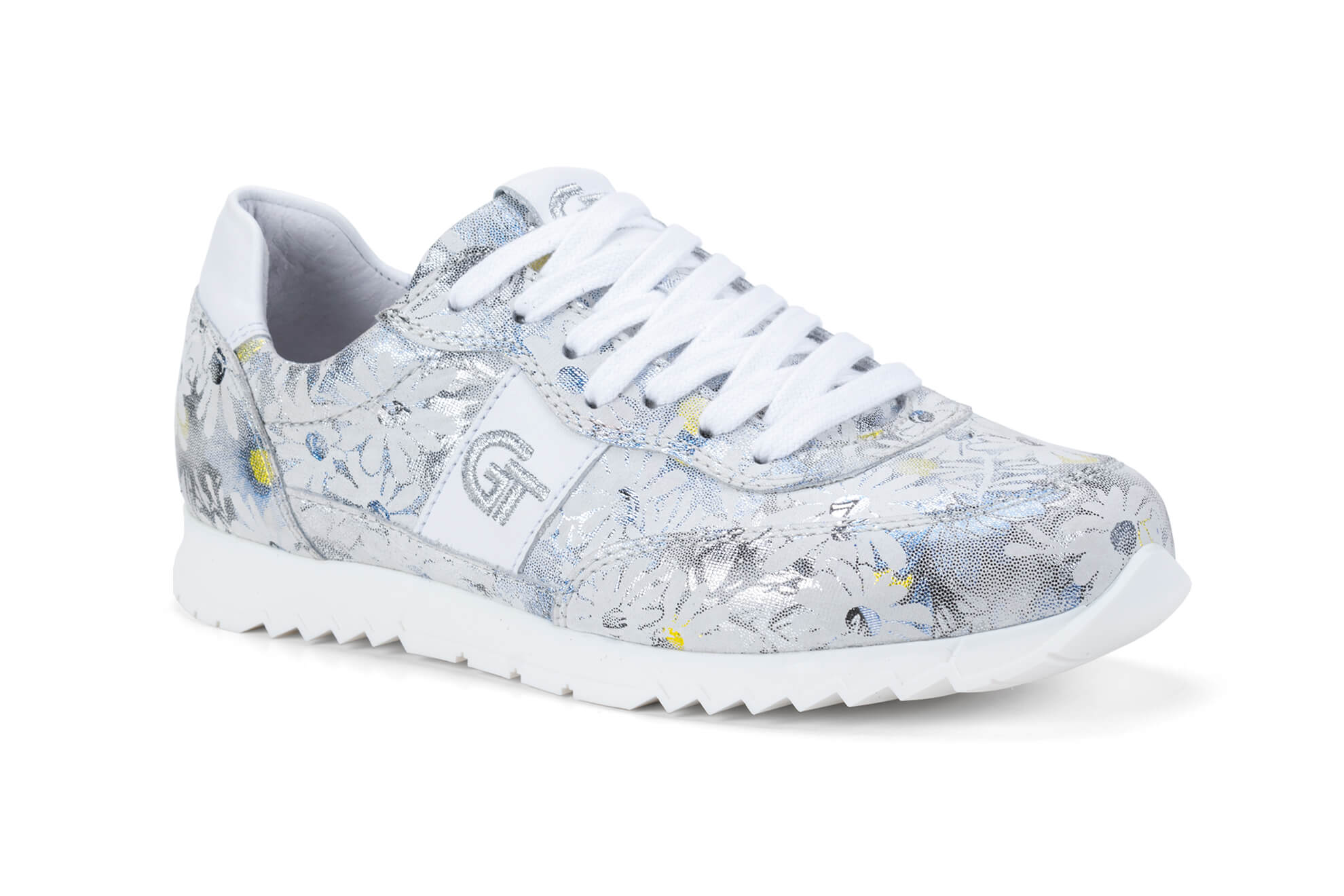 A G&T Aktív Margaréta bőr sportcipő a különleges ezüst és fehér árnyalatokban pompázó mintás nubuk anyagból készül. A fehér virágminták, melyek az ezüstös mozaik mintás felületeked fedik különleges hatást érnek el azzal hogy apró mozaik mintákon megcsillan az ezüstös fény, ami tovább emeli a különleges látványt. Nőieséget sugároz és a könnyed ezüstös csillogásnak köszönhetően tökéletesen illeszthető be a ruhatáradba. Elegáns alkalmakkor vagy sportos hétköznapokon is tökéletes választás. A fények játékában amint a fehér virág minta kirajzolódik a mozaikmintás bőrön, azonnal különleges látványt nyújt a cipő viselőjének. A különleges hatást az ezüst színű cérnával hímzett logóval emeltük még magasabb szintre. Ez az exkluzív mintás cipő tökéletes kiegészítője a fiatalos, streatwear viseletnek, kellemes megjelenése mellett kimagasló komfortérzetet nyújt a cipő viselőjének!