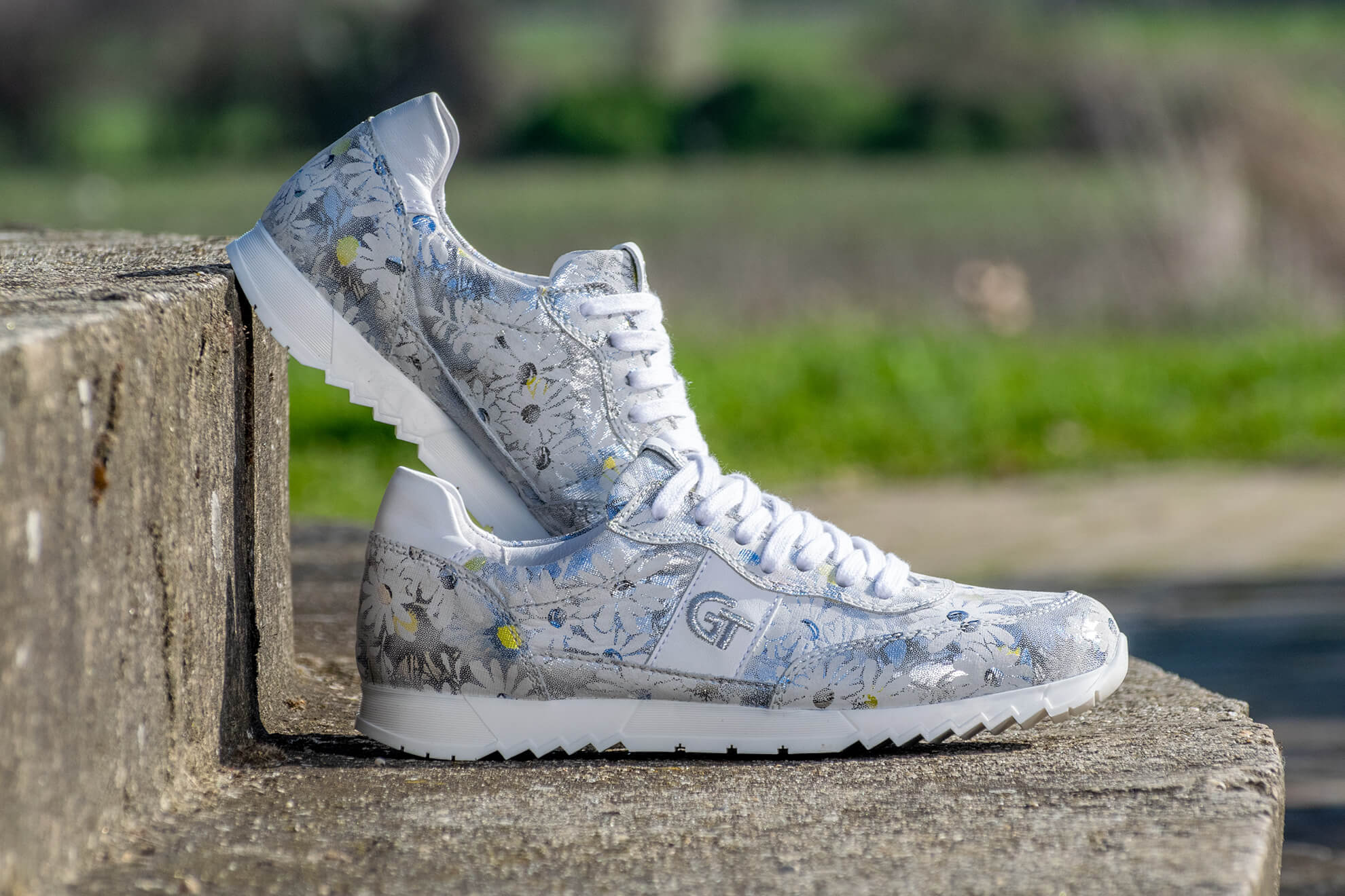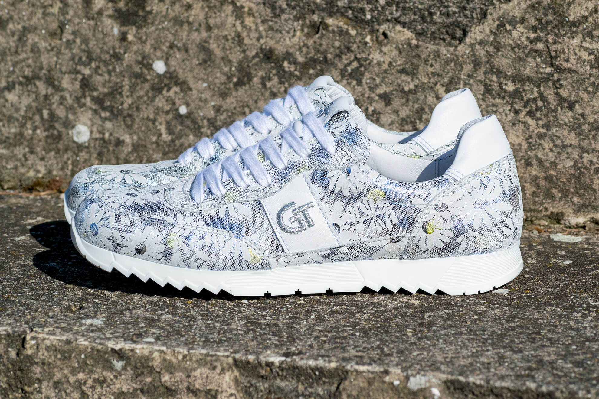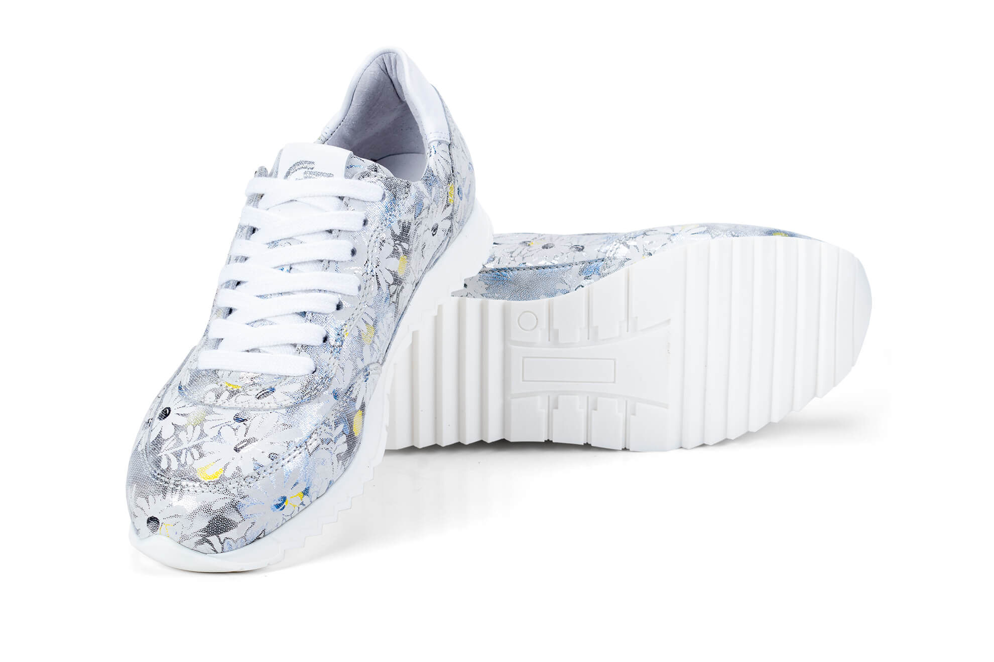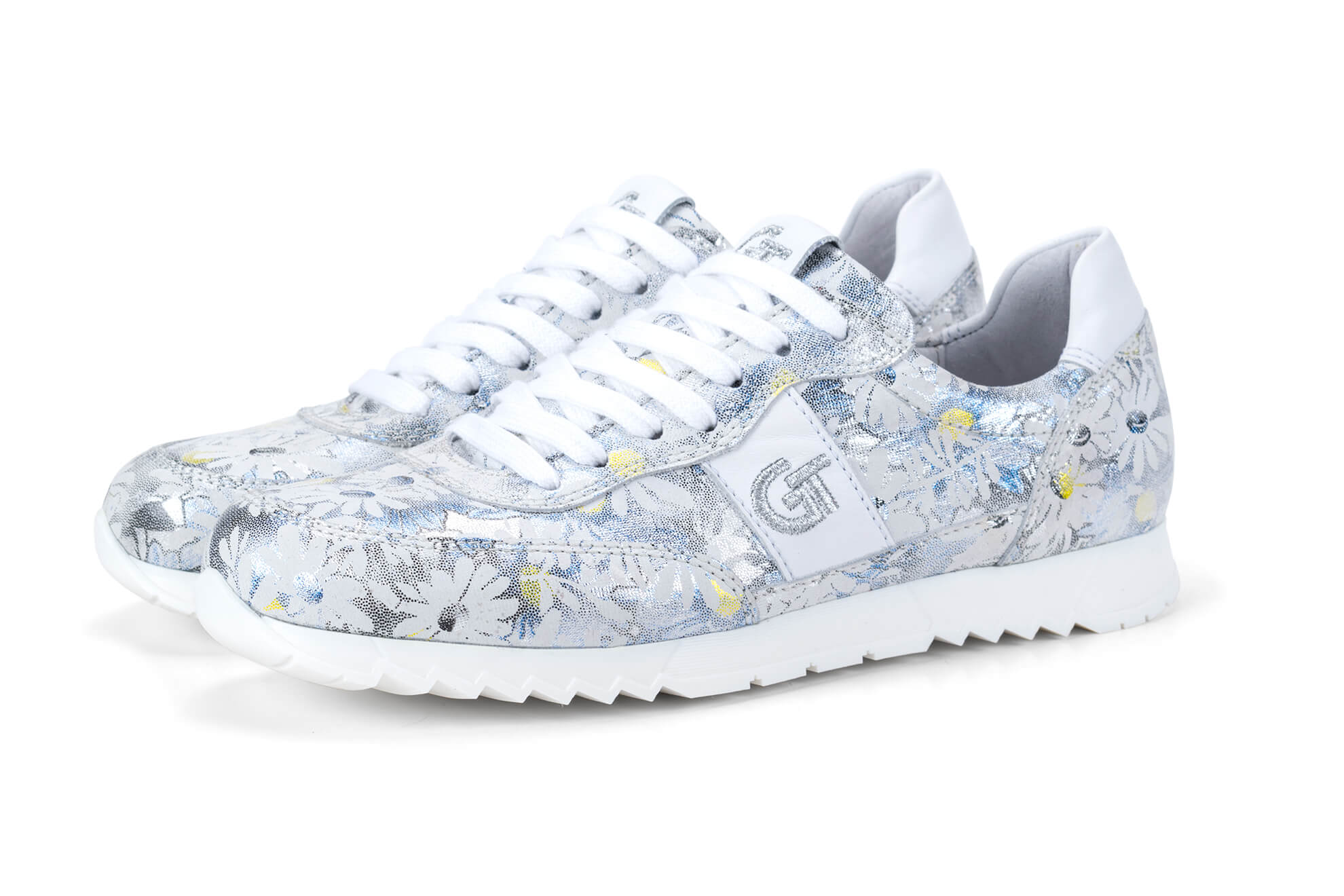 A G&T Aktív Margaréta bőr sportcipő a különleges ezüst és fehér árnyalatokban pompázó mintás nubuk anyagból készül. A fehér virágminták, melyek az ezüstös mozaik mintás felületeked fedik különleges hatást érnek el azzal hogy apró mozaik mintákon megcsillan az ezüstös fény, ami tovább emeli a különleges látványt. Nőieséget sugároz és a könnyed ezüstös csillogásnak köszönhetően tökéletesen illeszthető be a ruhatáradba. Elegáns alkalmakkor vagy sportos hétköznapokon is tökéletes választás. A fények játékában amint a fehér virág minta kirajzolódik a mozaikmintás bőrön, azonnal különleges látványt nyújt a cipő viselőjének. A különleges hatást az ezüst színű cérnával hímzett logóval emeltük még magasabb szintre. Ez az exkluzív mintás cipő tökéletes kiegészítője a fiatalos, streatwear viseletnek, kellemes megjelenése mellett kimagasló komfortérzetet nyújt a cipő viselőjének!