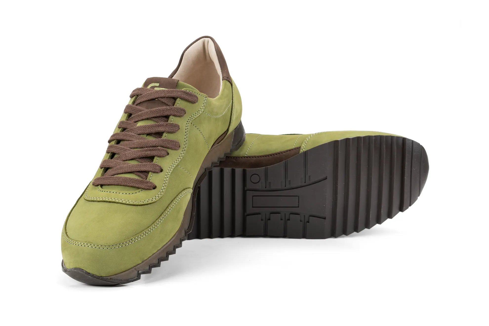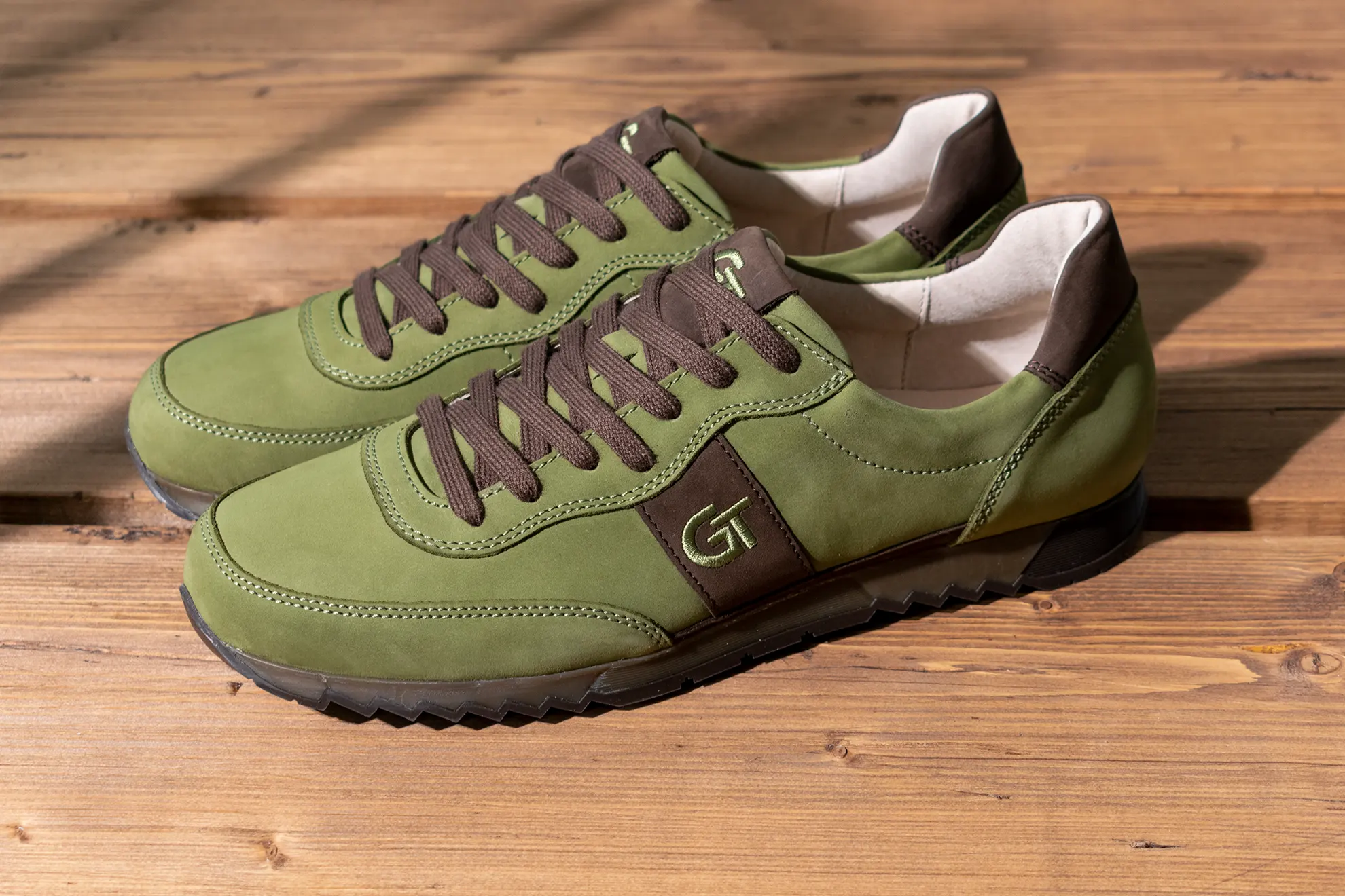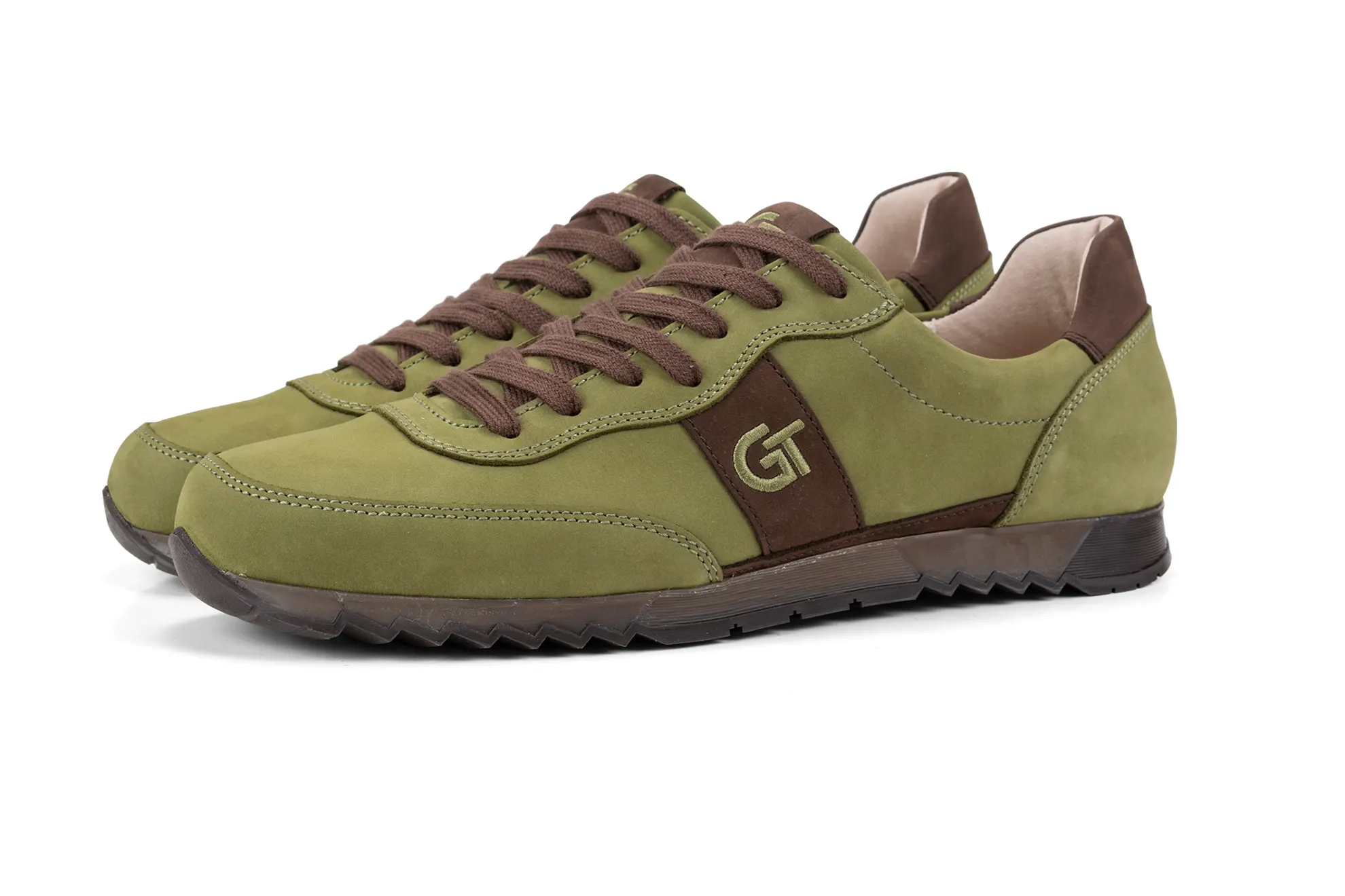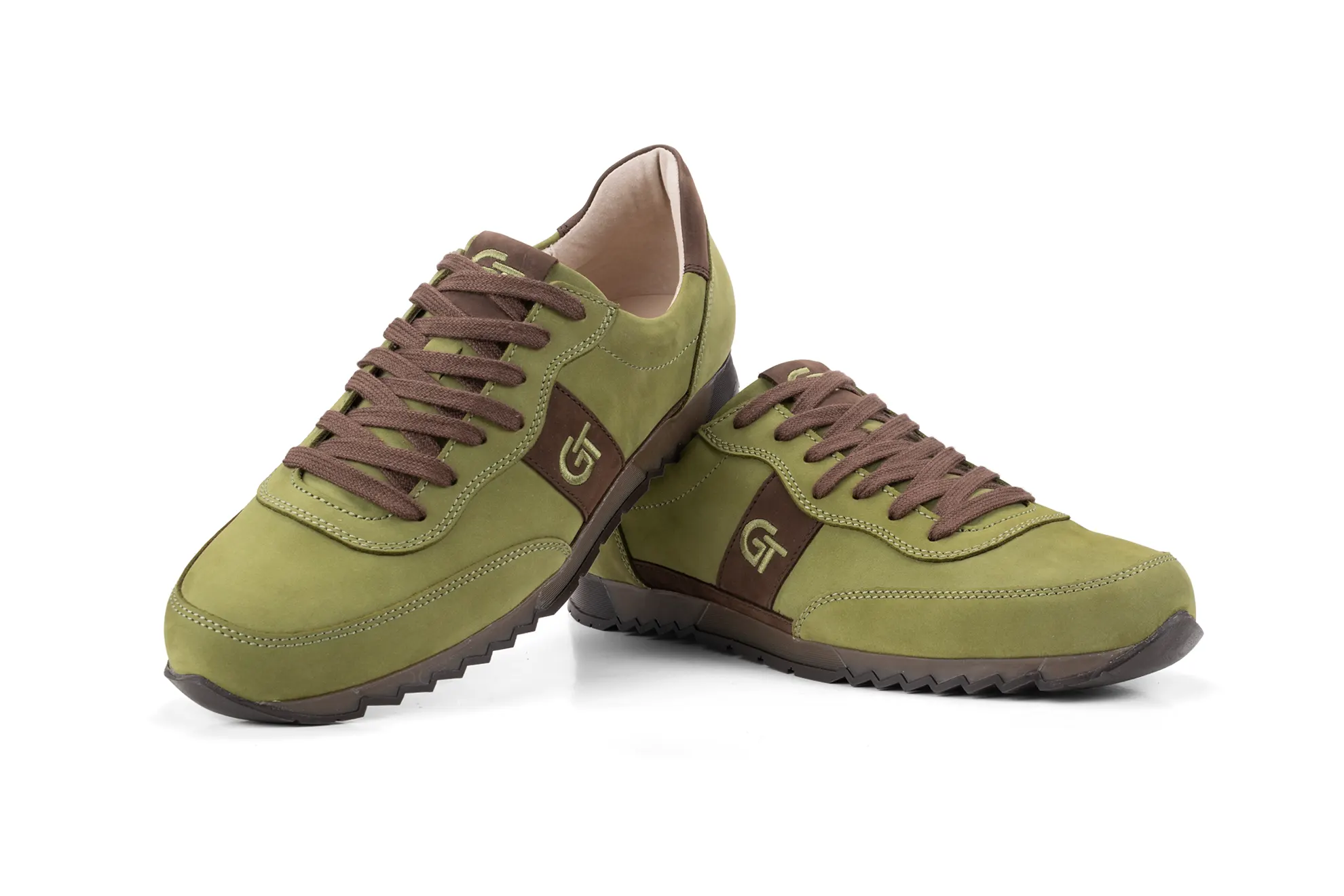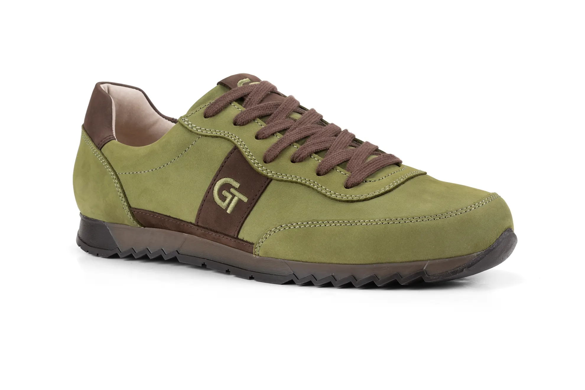 A G&T Aktív Vadász bőr sportcipő prémium minőségű nubuk bőrökből készült, egy kedves vadász ismerősünk kérésére. Ez a gyönyörű mohazöld szín a sziena barna díszítésekkel annyira szép lett, hogy elhatároztuk, hogy a kínálatunkba is felkerül. A mohazöld és sziena barna felsőrészhez színben passzoló barna TR talpat raktuk. A gyönyörű zöld árnyalatú felsőrész az őszi szezon egyik legkülönlegesebb színű anyagából készült. A különleges megjelenést a zöld árnyalatú cérnával hímzett logóval emeltük még magasabb szintre.
