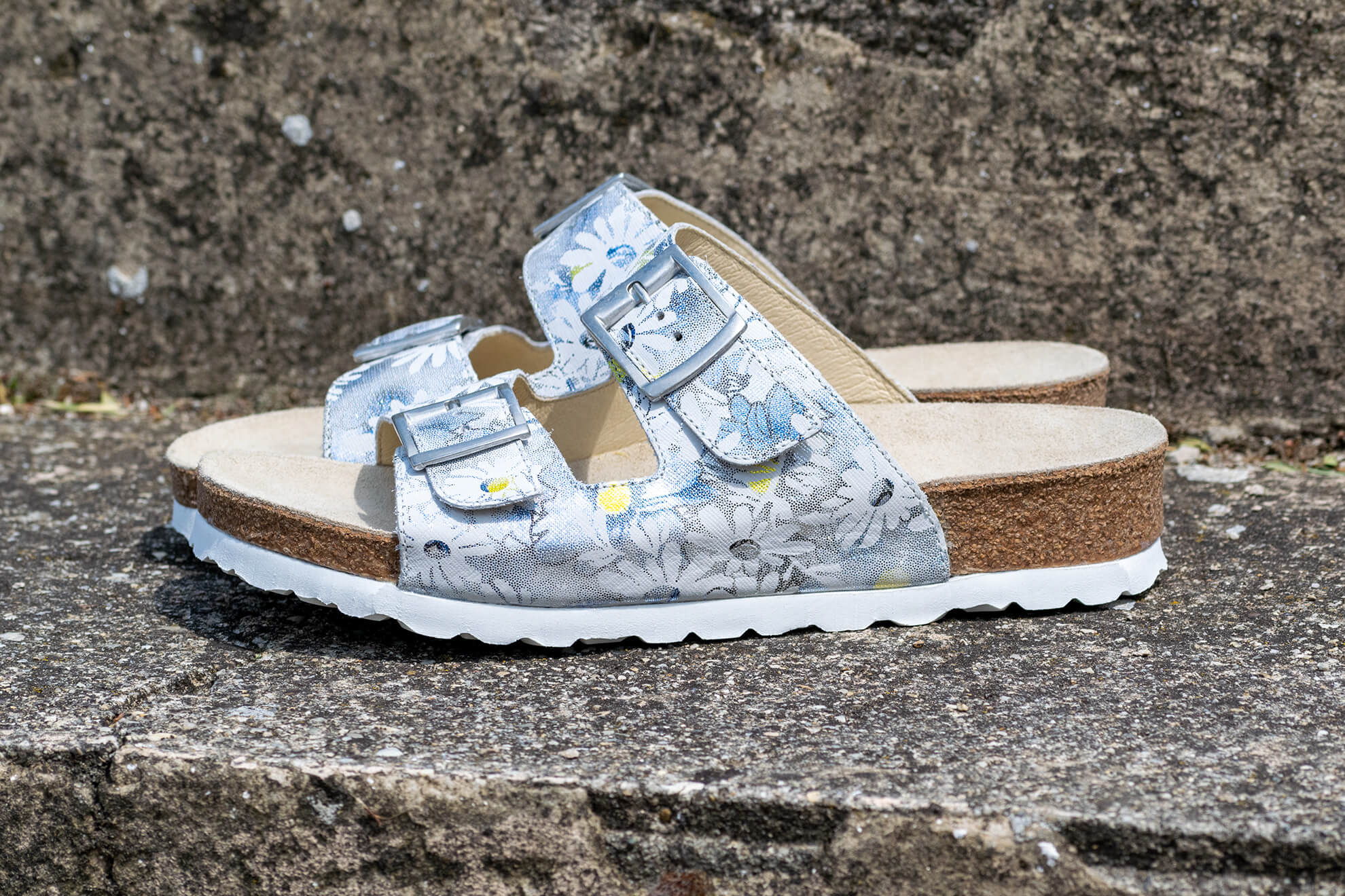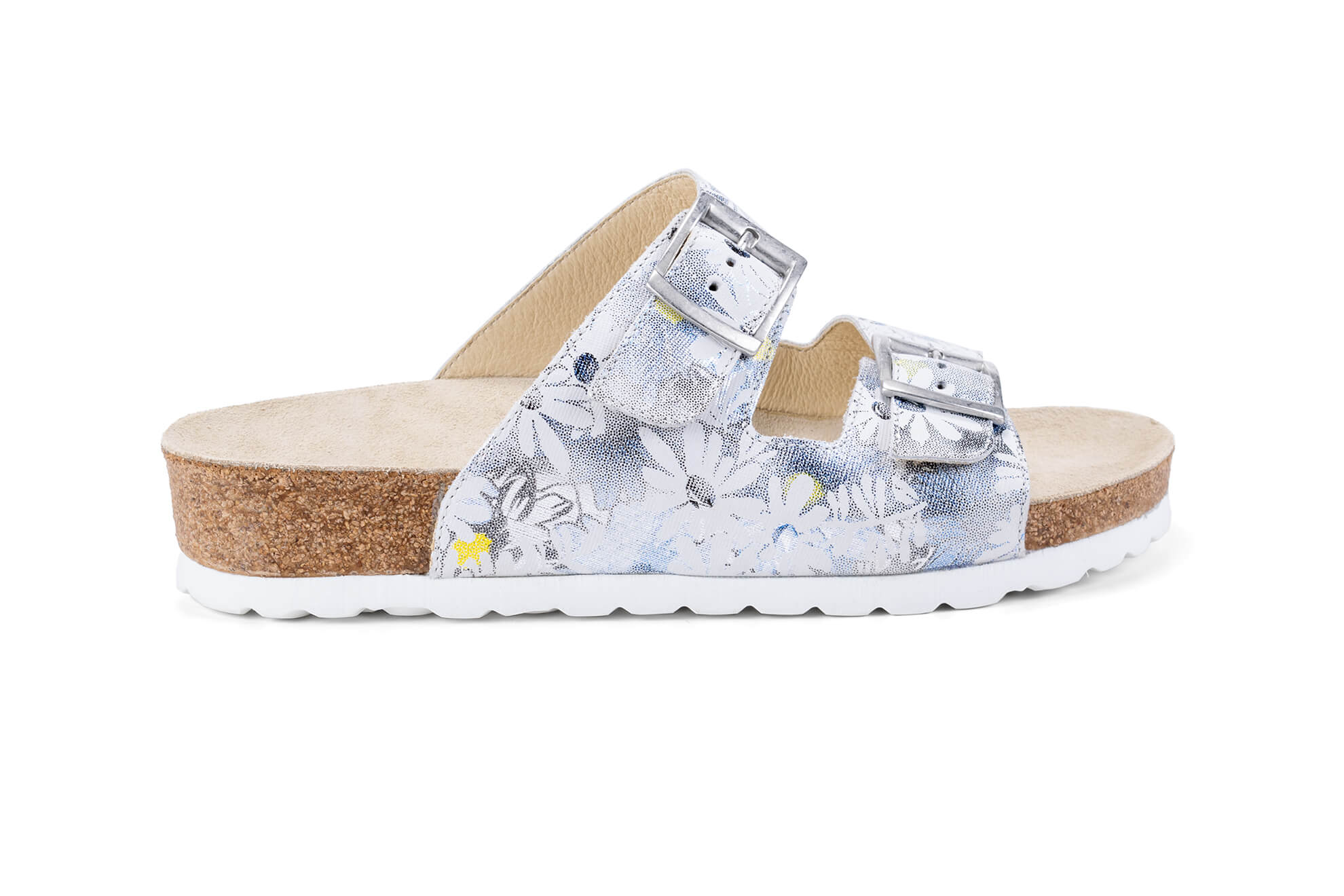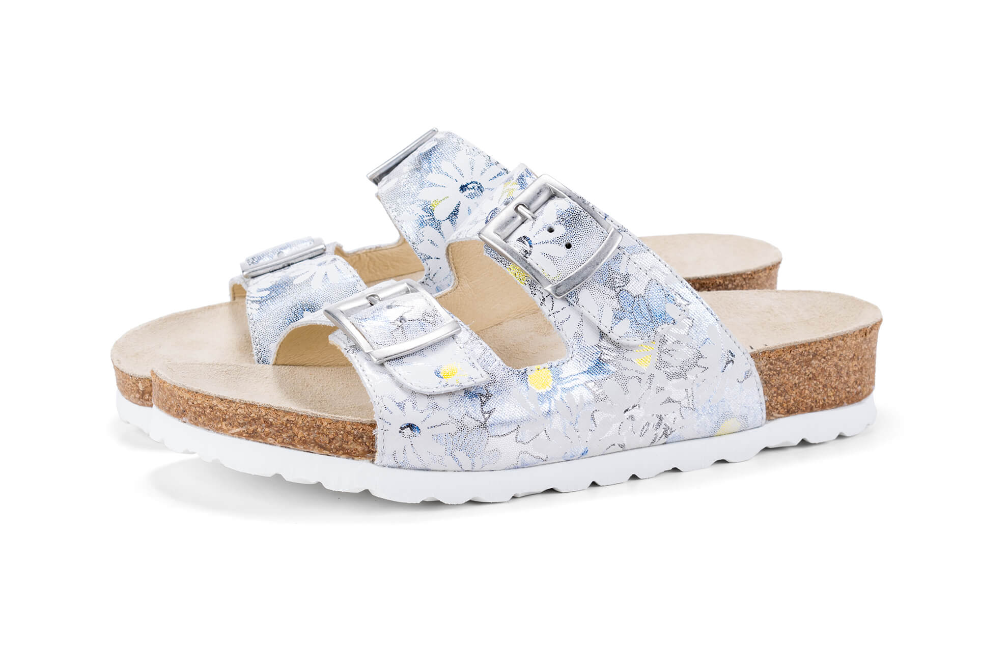 - Nőies kényelem: A széles pántok kiválóan tartják a lábfejet, biztosítva a kényelmet minden lépésnél, miközben a fehér alapon ezüstös virágminta és margaréta motívumok nőies megjelenést kölcsönöznek.