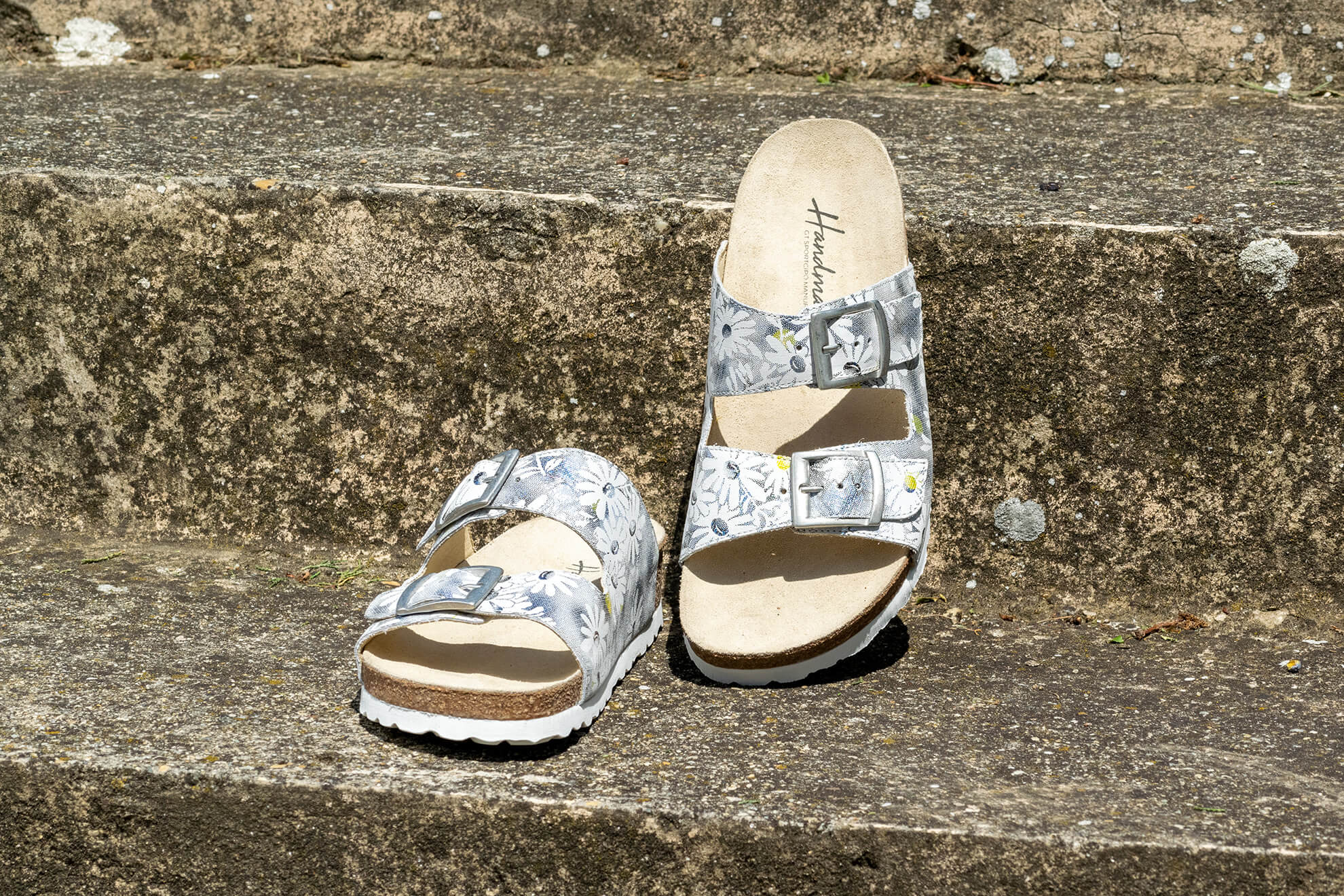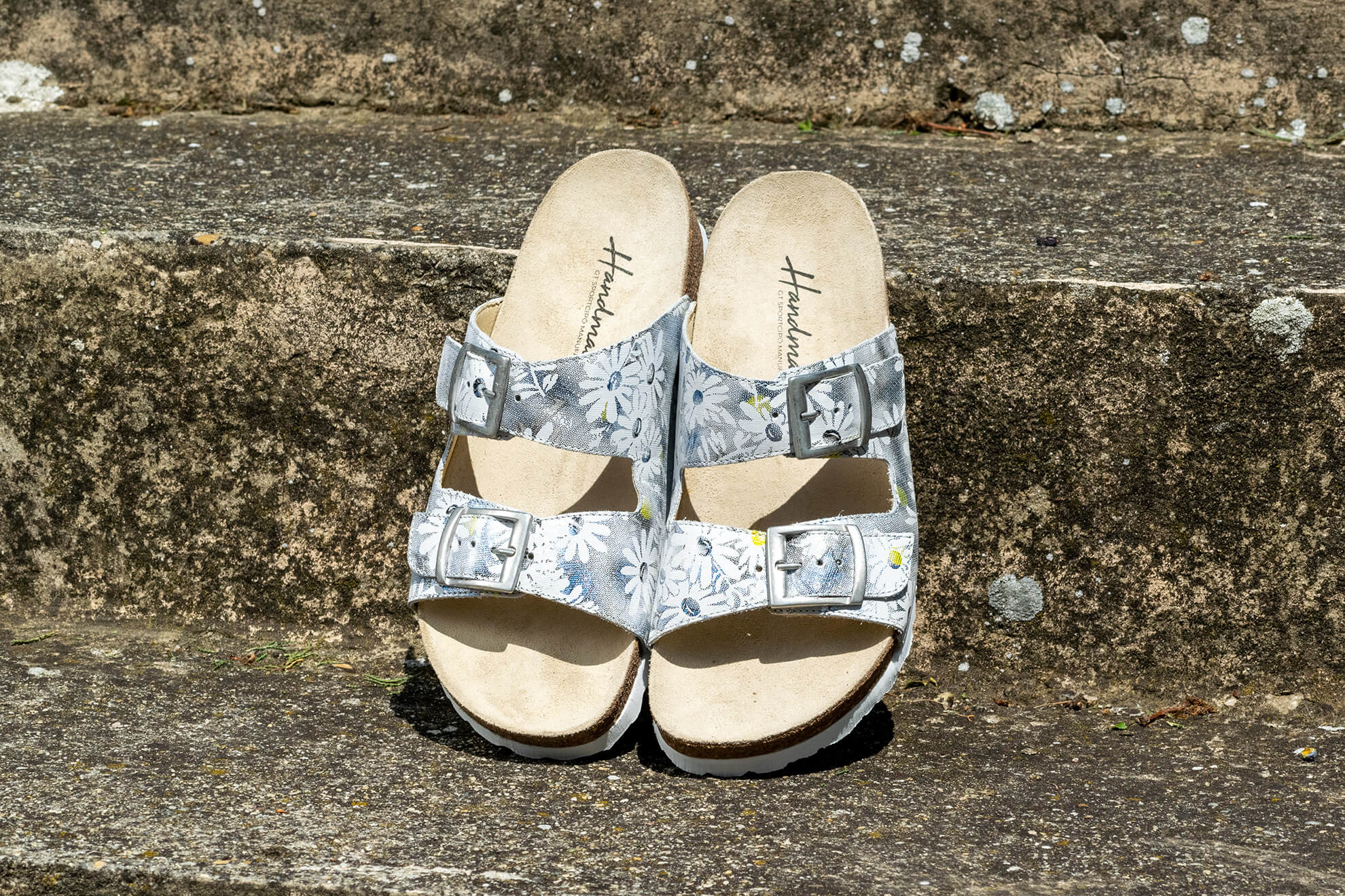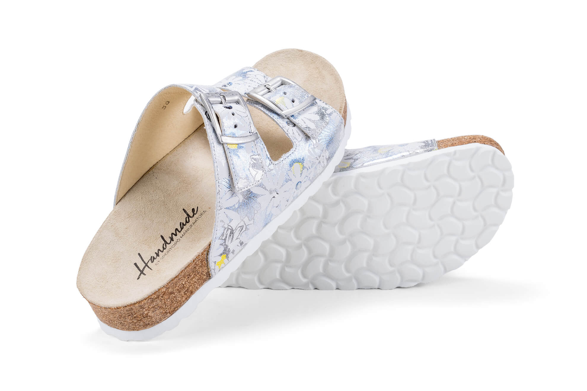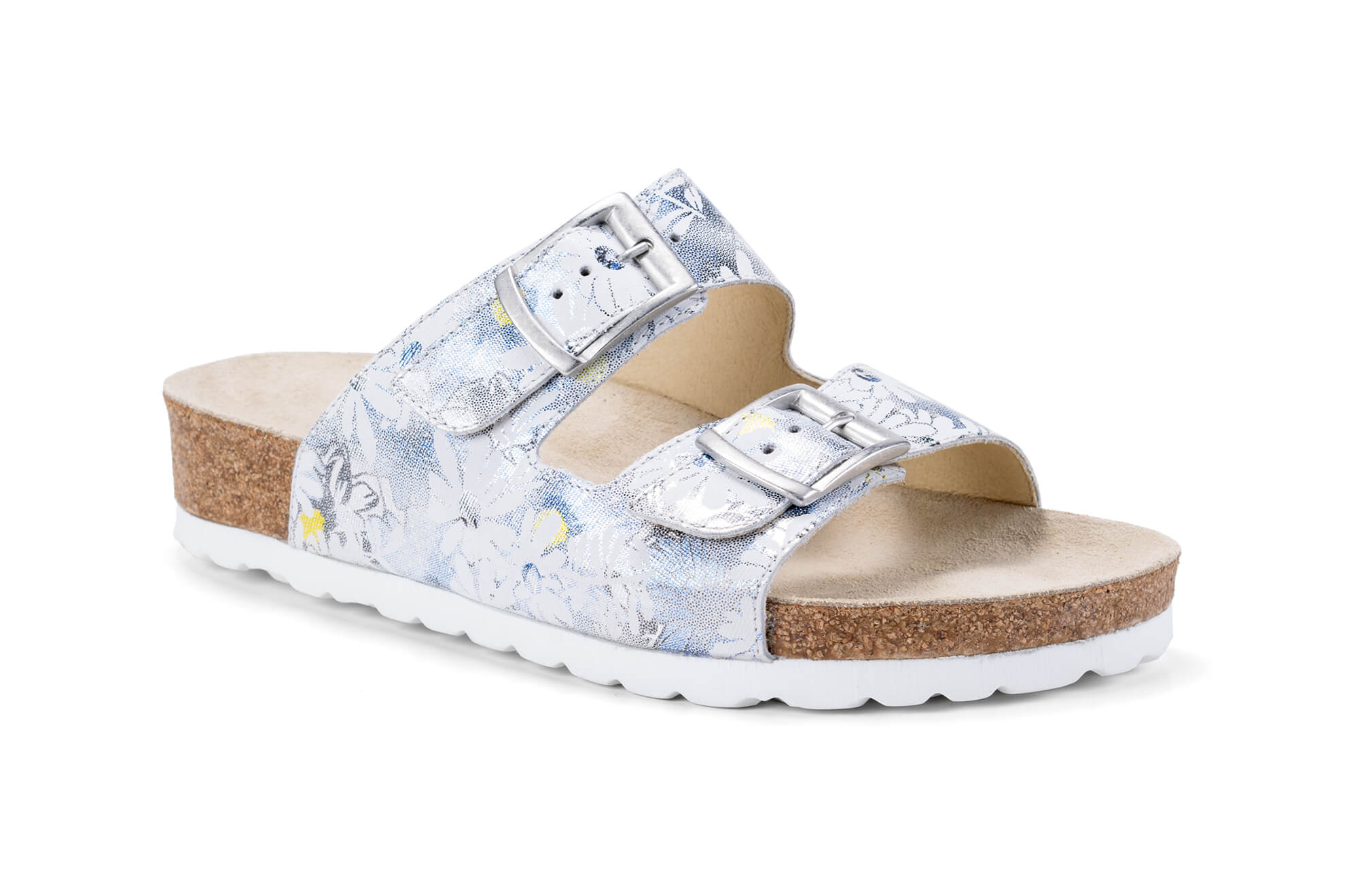 - Nőies kényelem: A széles pántok kiválóan tartják a lábfejet, biztosítva a kényelmet minden lépésnél, miközben a fehér alapon ezüstös virágminta és margaréta motívumok nőies megjelenést kölcsönöznek.
