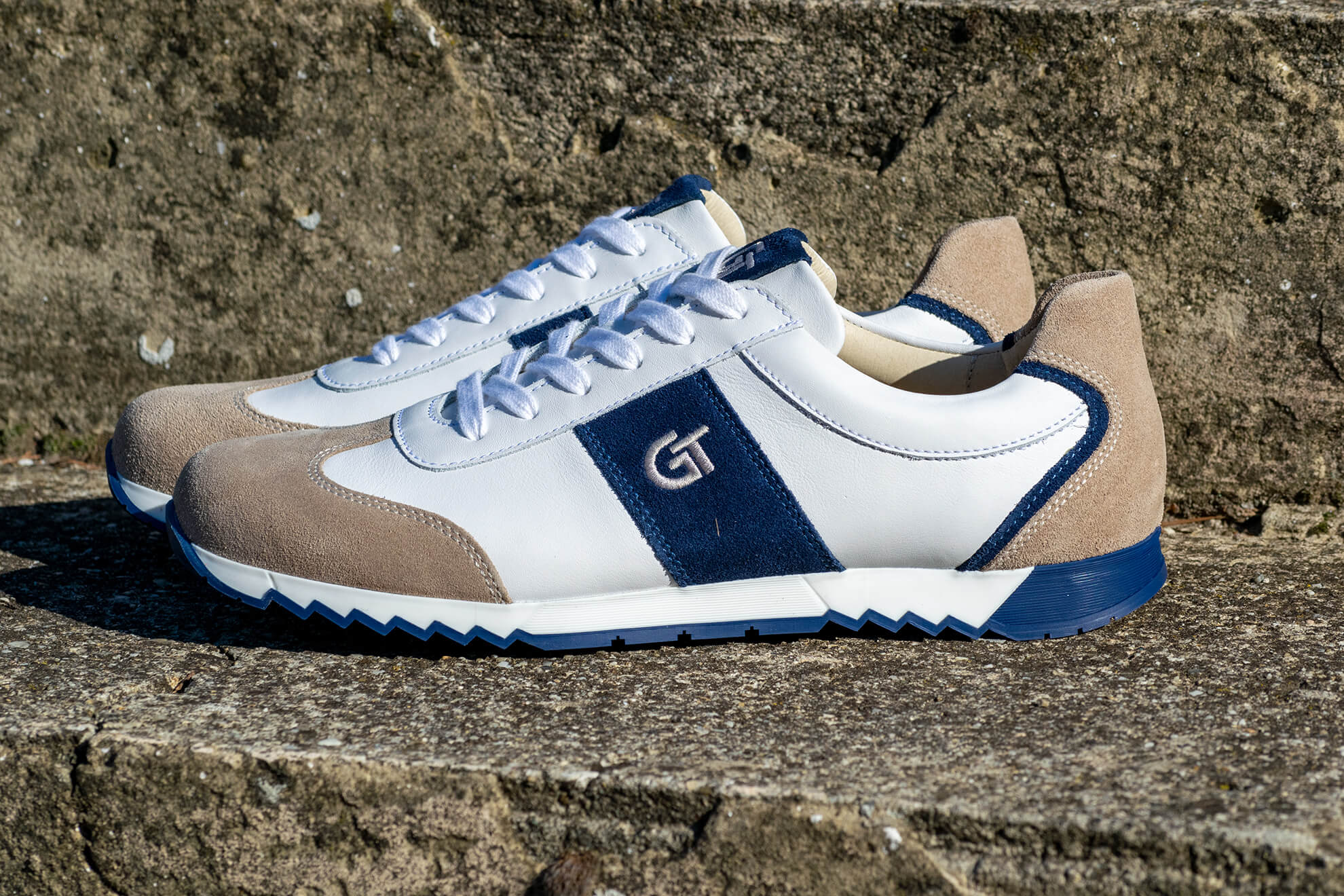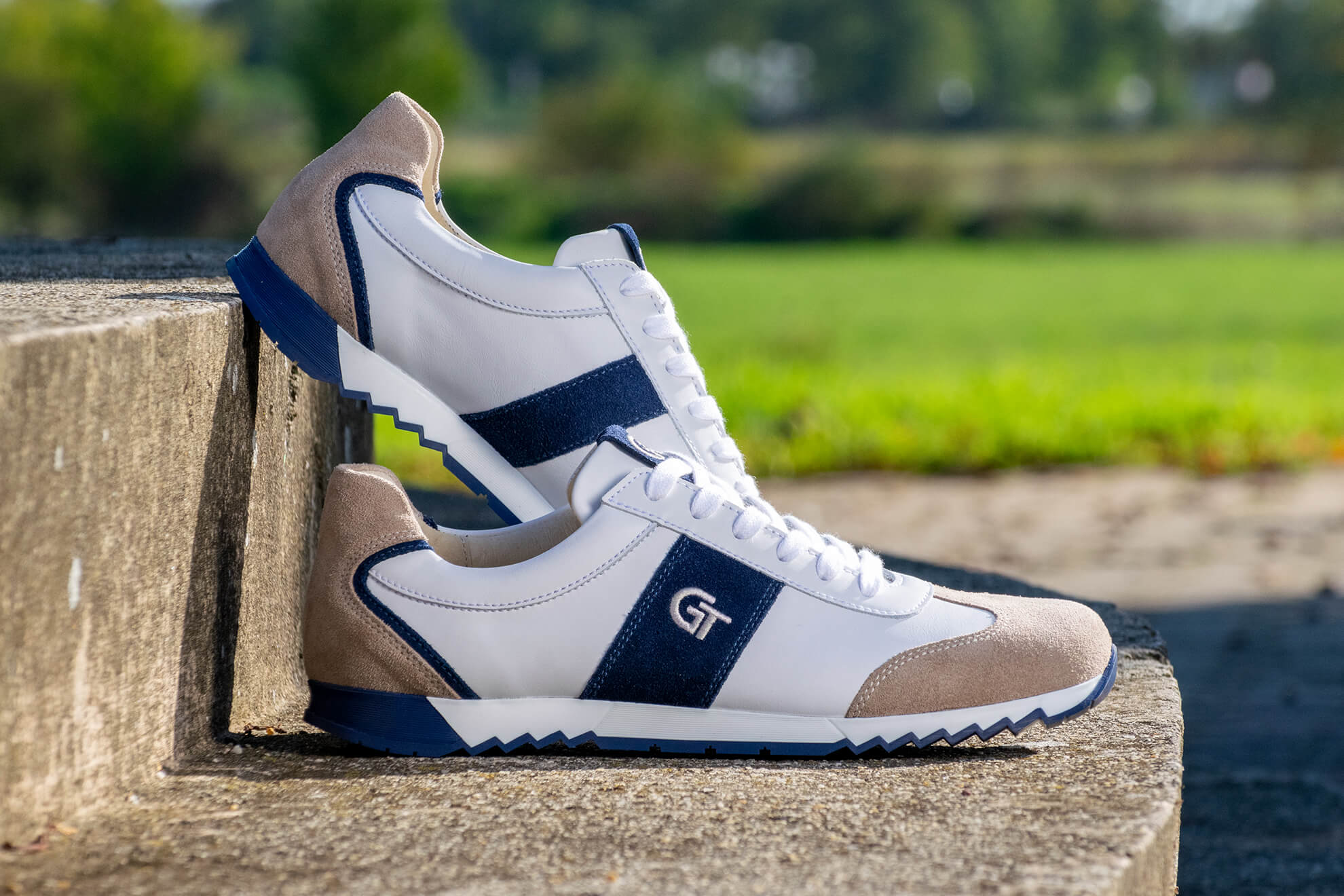A G&T Sprint Milánó bőr sportcipő valódi bélésbőrrel bélelt, így a kényelem és a tartósság garantált. A bézs hímzett GT logó elegáns kiemelése az exkluzív megjelenésnek, amely divatot diktál, miközben a fehér fűző és a kék-fehér ragasztott talp kiemeli a cipő modern dizájnját.